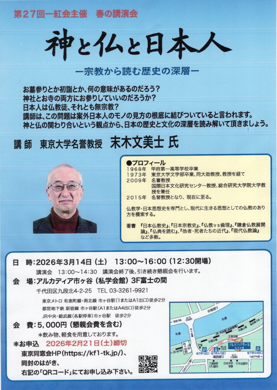 | 講演会次第と参加申し込み者 講演会案内チラシ 講演資料「神と仏と日本人」 2026年5月9日甲府一高同窓会・案内チラシ 2026年7月11日第66回甲府一高東京同窓会チラシ 甲府一高あおぞら会 |